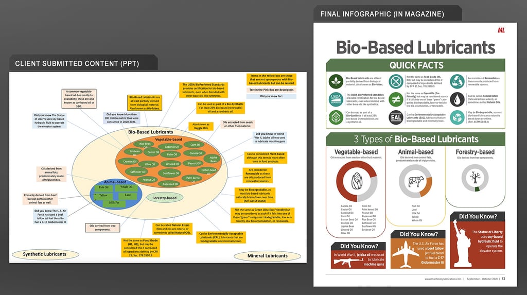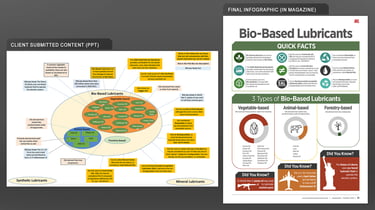 This is an example of the transformation from original supplied data into a concise, engaging and easy to understand infographic page that ran as part of an article focusing on bio-based lubricants.